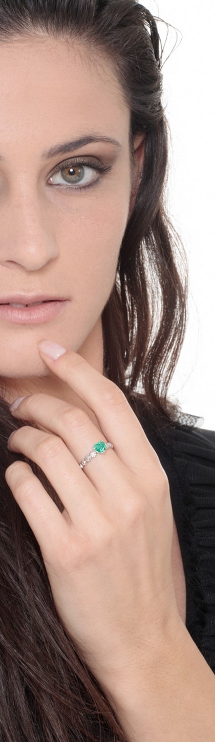 Anello in oro bianco 18k, con incastonato smeraldo taglio a cuore e diamanti laterali taglio brillante, colore G e purezza Vs.
