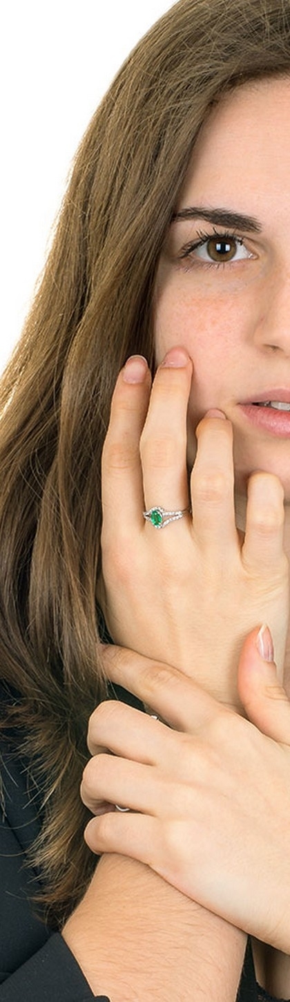 Anello contorno in Oro bianco 18k con incastonati al centro smeraldo taglio ovale e nel contorno diamanti taglio brillante, colore G, purezza Vs.