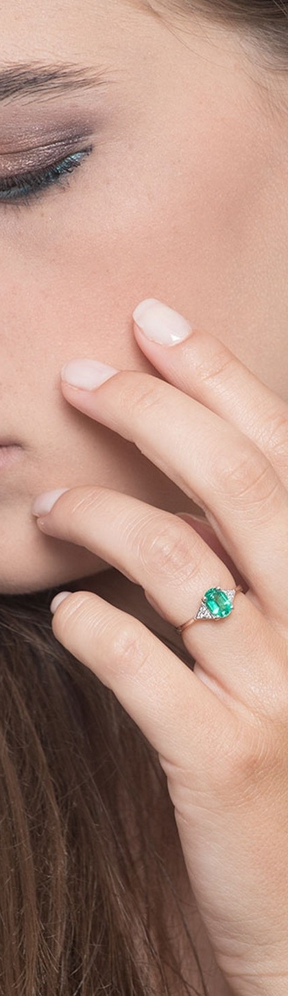 Anello da Donna in Oro bianco 18k con incastonato Smeraldo taglio ovale e diamanti taglio brillante, colore G, purezza Vs.