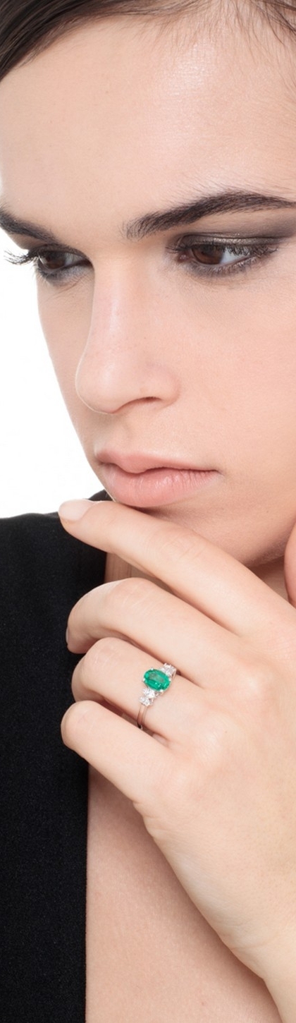 Anello in Oro Bianco 18k con incastonato Smeraldo centrale taglio ovale di circa mm 9x6 e sui lati Diamanti taglio brillante Colore G e Purezza Vs.