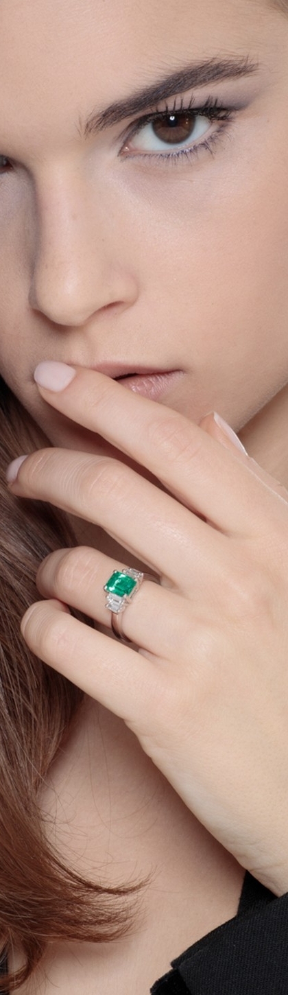 Anello in oro bianco 18k con Smeraldo e Diamanti taglio baguette.