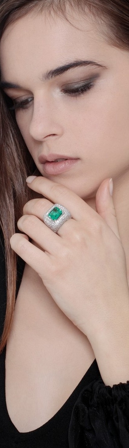 Anello in oro bianco 18k con Smeraldo e pavè di diamanti