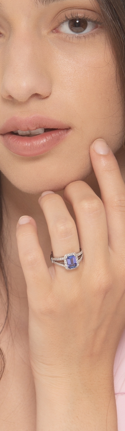 Anello in oro bianco 18k con Tanzanite al centro e diamanti ai lati e sul gambo