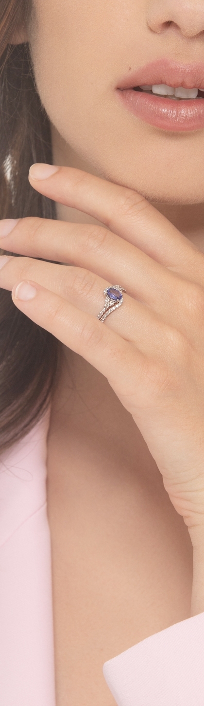 Anello in oro bianco 18k con tanzanite e diamanti anche sul gambo