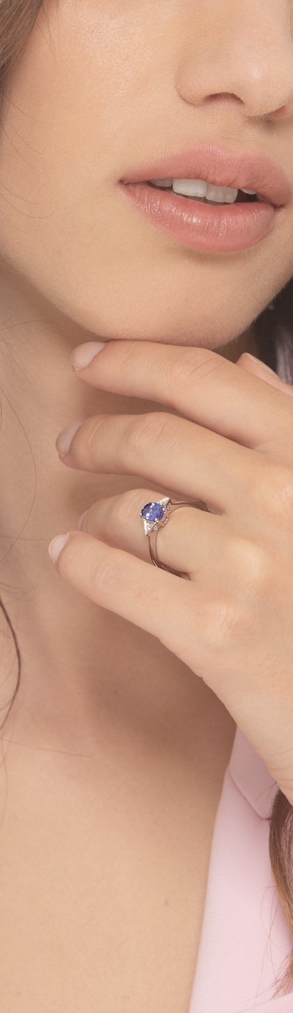 Anello in oro bianco 18k con tanzanite ovale e 2 diamanti ai lati