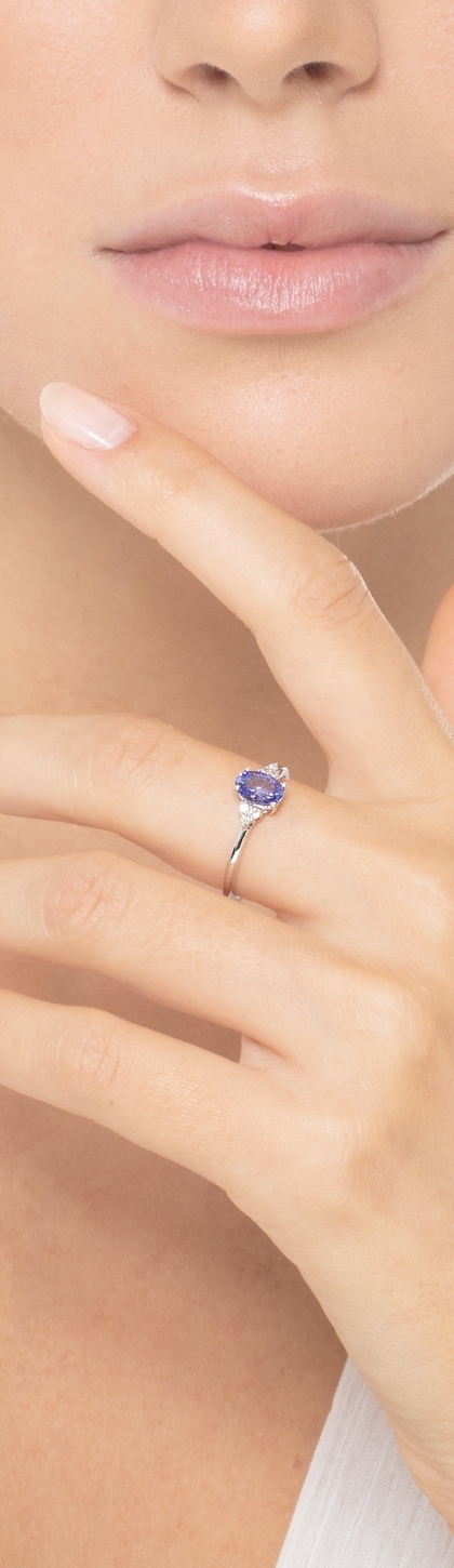 Anello in oro bianco 18k con tanzanite ovale incastonata al centro e 3 diamanti per lato