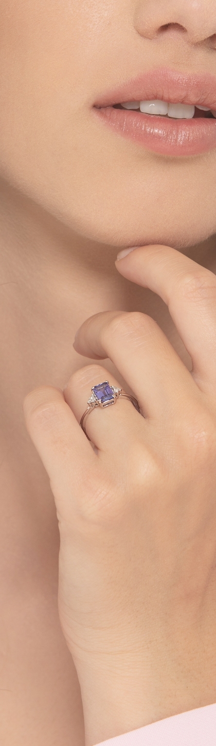 Anello in oro bianco 18k con tanzanite rettangolare e 3 diamanti per lato