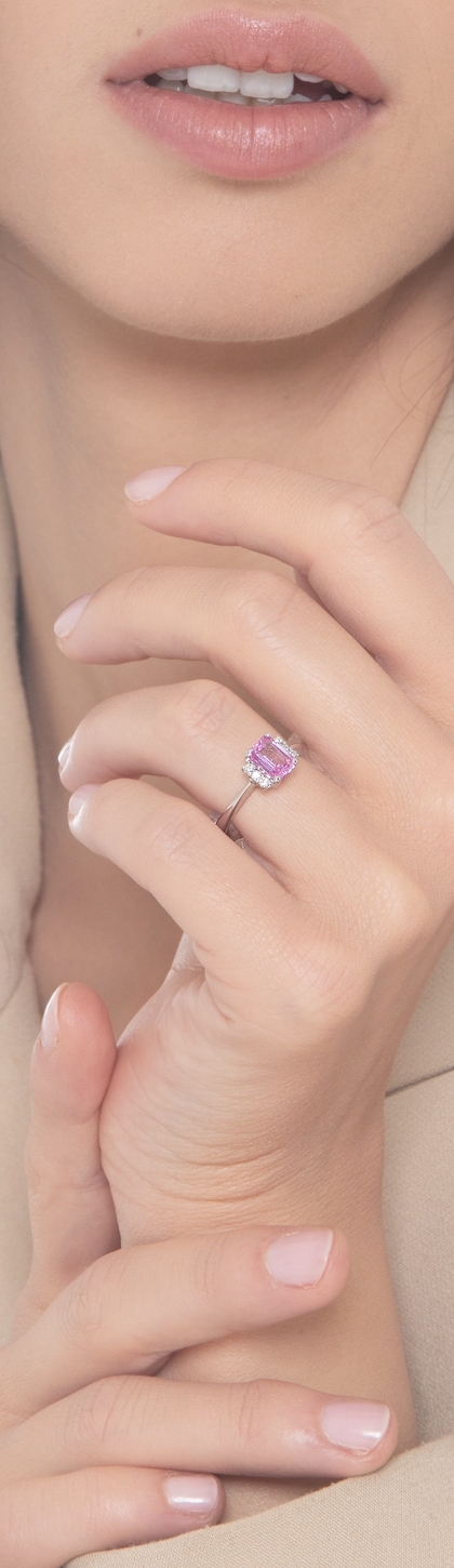 Anello in oro bianco 18k con tre diamanti laterali e Zaffiro Rosa rettangolare di circa 7x5 mm