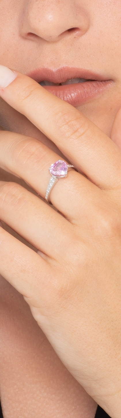 Anello in oro bianco 18k con zaffiro rosa a cuore e diamanti ai lati