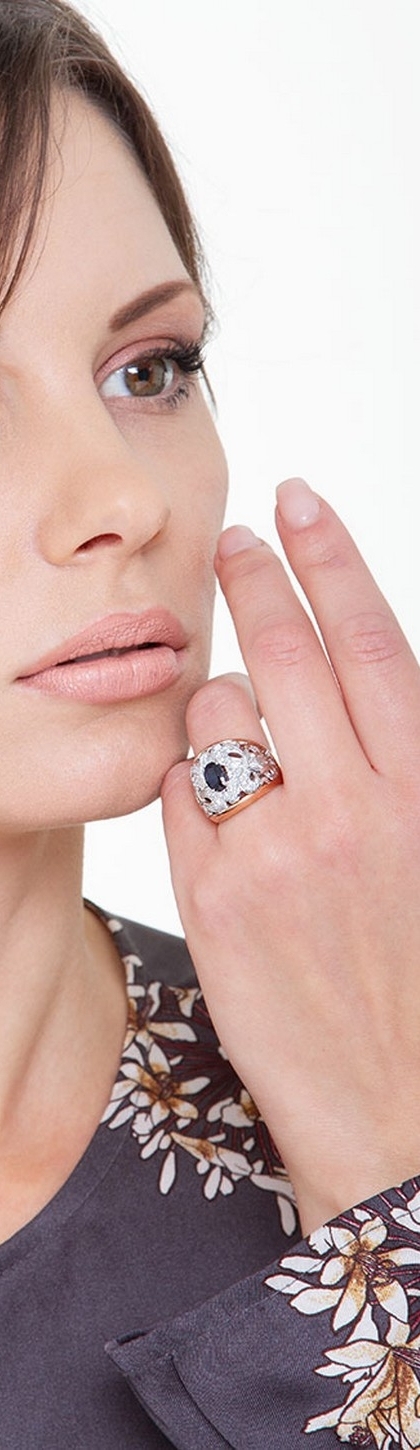 Anello in oro bianco e rosa 18k con diamanti e zaffiro blu centrale