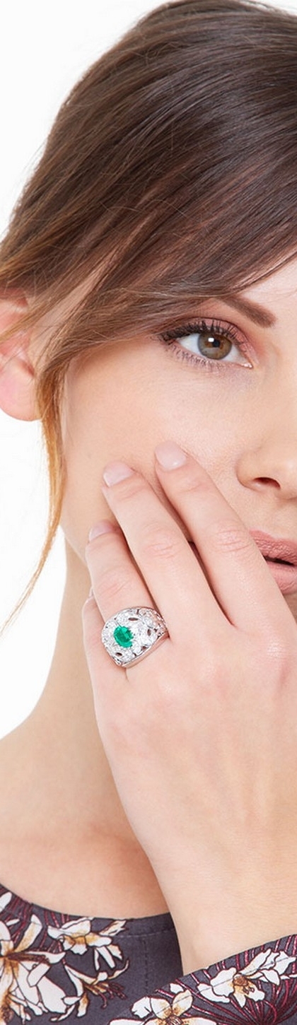Anello ricamo in oro bianco 18k con smeraldo e diamanti