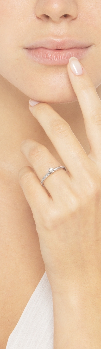 Anello solitario in oro bianco 18k a sei griffe con diamanti taglio brillante anche sul gambo. Il diamante centrale è di 0,15 carati.