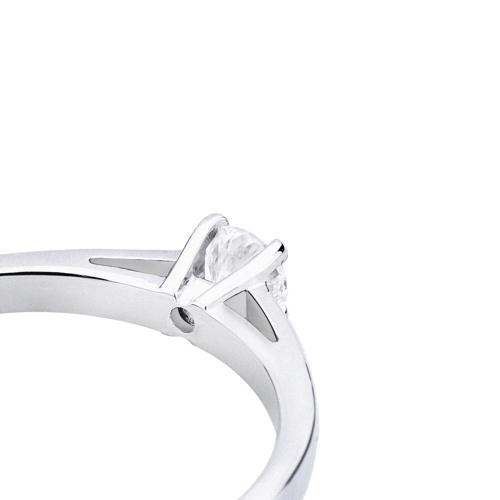 Anello solitario in oro bianco 18k, quattro griffe con diamante taglio brillante, colore G, purezza Vs.