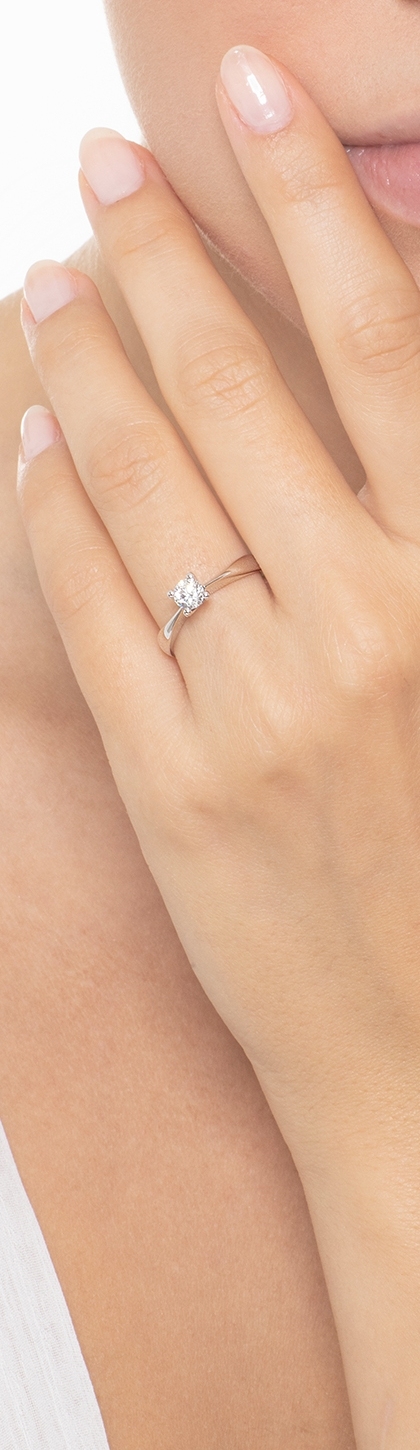 Anello solitario lineare a quattro griffe in oro bianco 18k con diamante taglio brillante.
