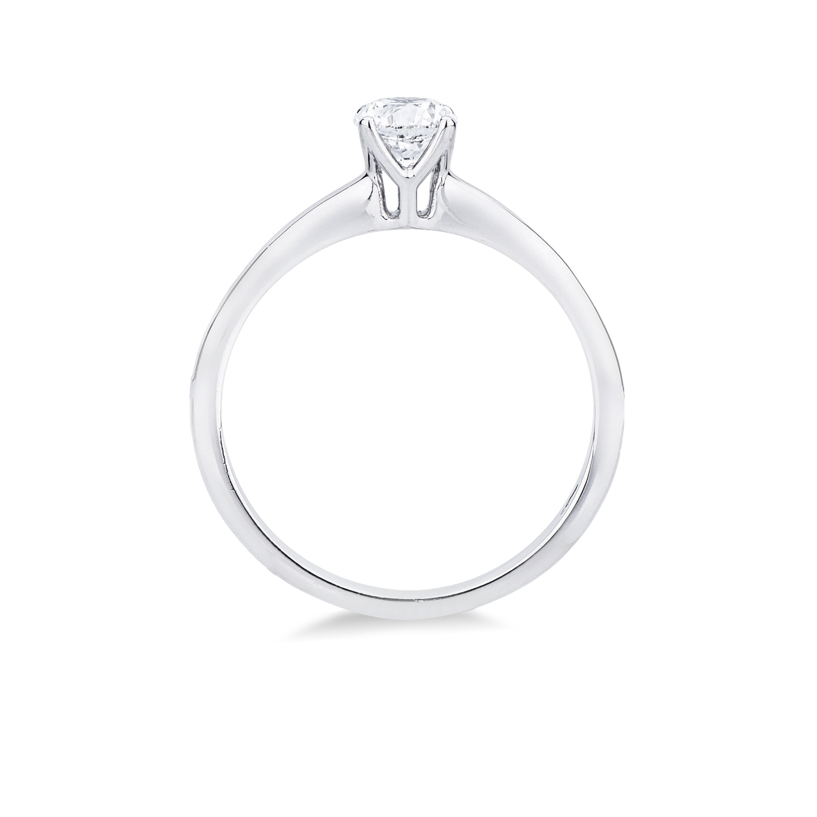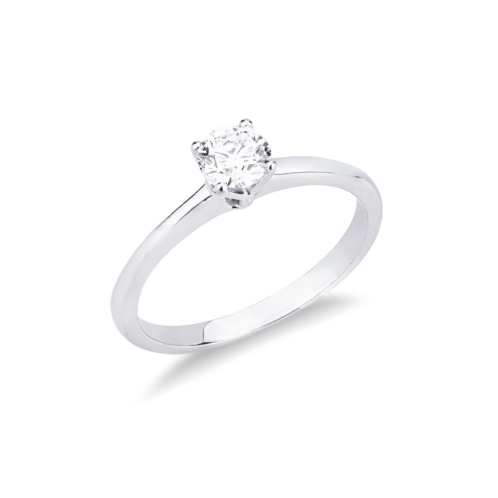 Anello solitario in oro bianco 18k, quattro griffe con diamante taglio brillante, colore G, purezza Vs.