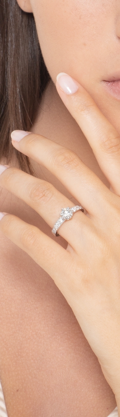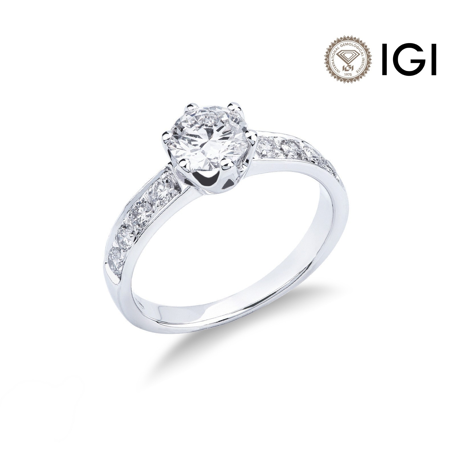 Anello tipo Solitario in oro bianco 18k con diamante centrale taglio brillante, colore G, purezza VS 2. I diamanti laterali hanno colore G e purezza Vs.