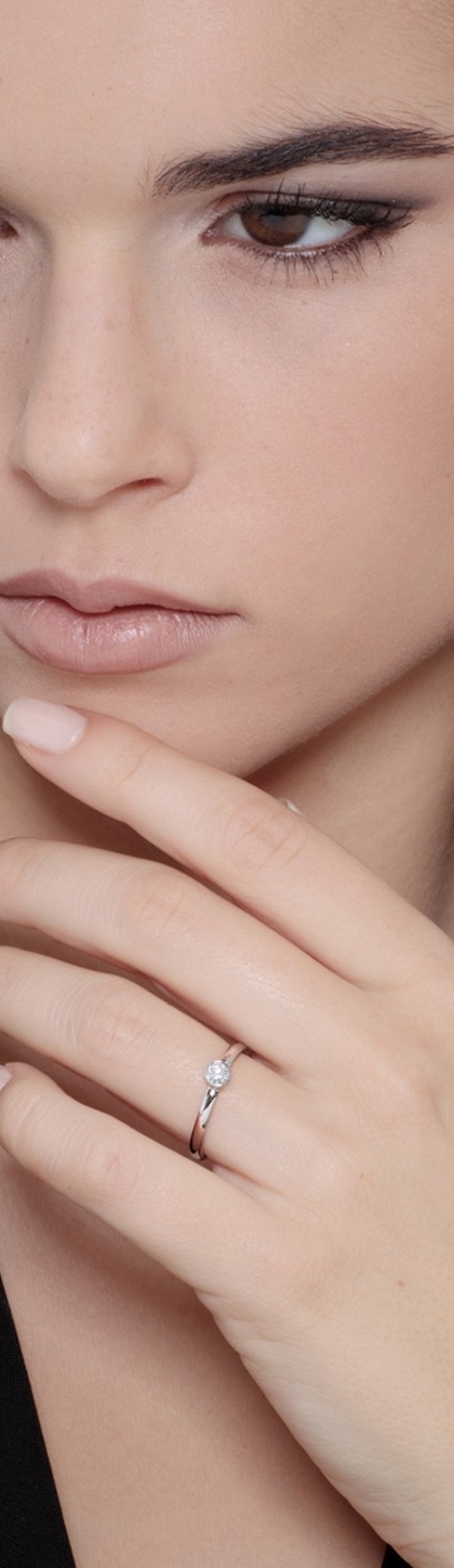 Un anello solitario dalle linee minimal ma d'effetto. La sua particolarità risiede nel castone centrale: rotondo, avvolge il completamente il diamante donando un look più moderno all'oggetto.