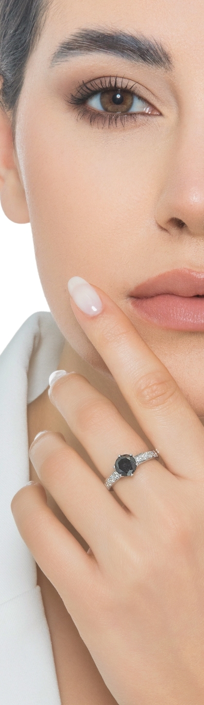 Anello da Donna Solitario griffe a sei punte a corona, in Oro Bianco 18k, con incastonato al centro diamante nero brillante e ai lati diamanti taglio brillante colore G e purezza Vs.