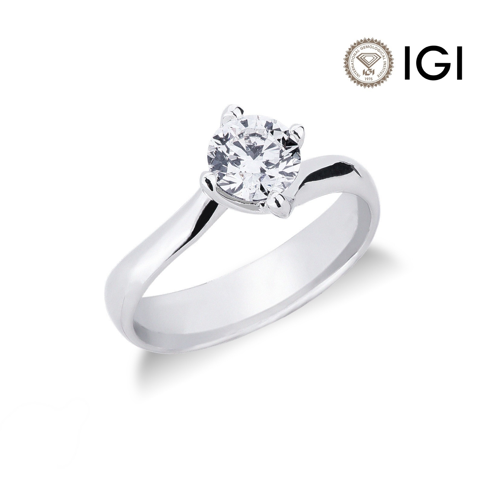 Anello Solitario griffe a quattro punte con gambo contrariè comfort, in Oro bianco 18k, con incastonato diamante taglio brillante colore G purezza VS 2.
