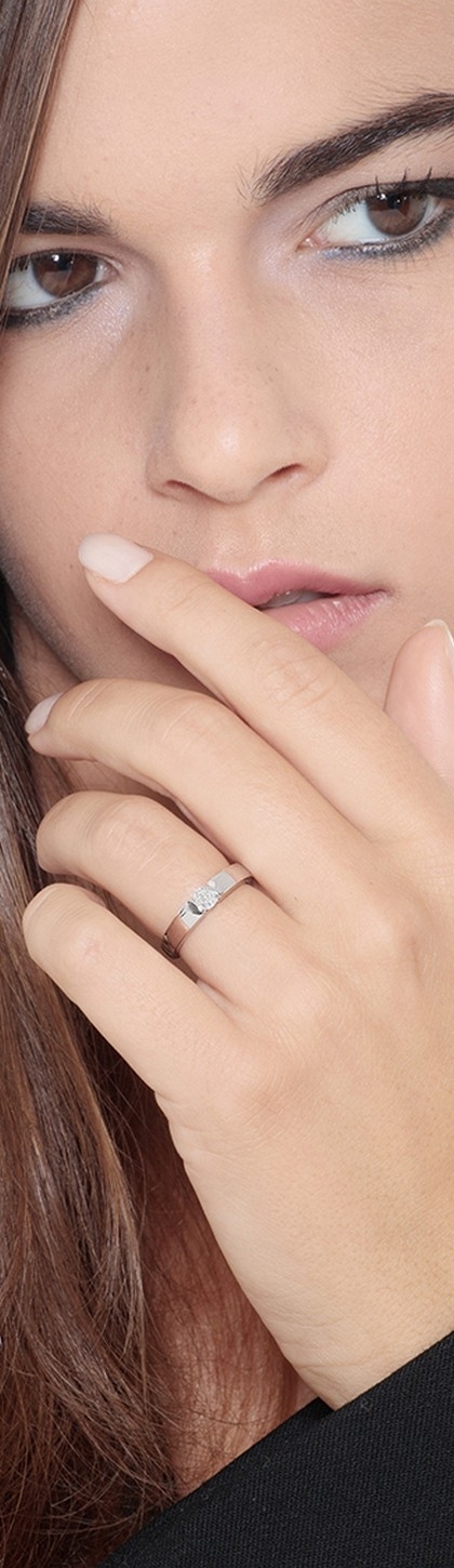 La sua particolarità risiede nel tipo di incastonatura utilizzata. Detta a battuto, questa tecnica orafa si basa sull'inserimento del diamante in una cavità ricavata nell'oro. Il diamante viene poi saldamente assicurato piegando con cura il bordo di metallo che lo circonda. Inoltre, la fascia più spessa fa si che l'anello sia confortevole da indossare quotidianamente.