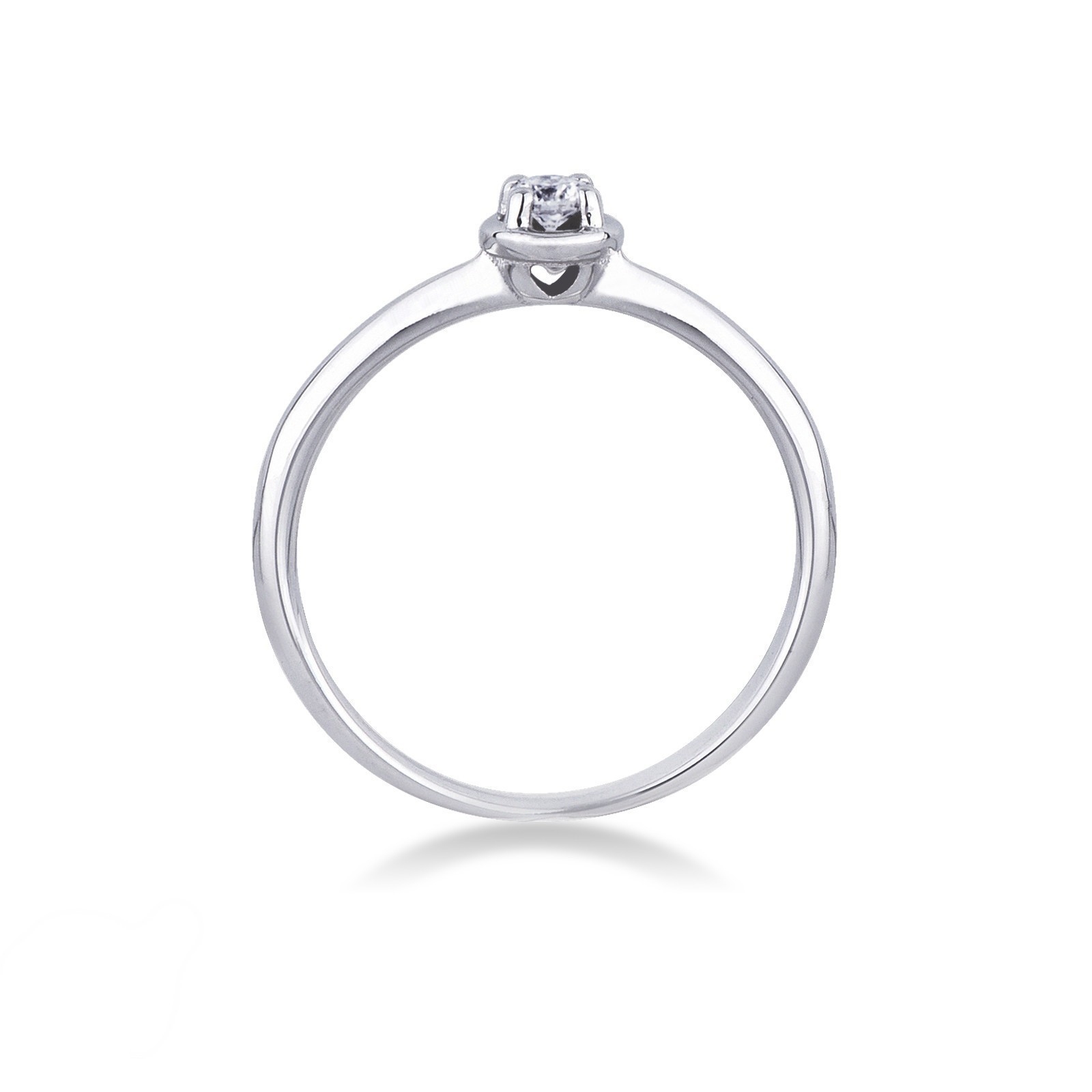 Anello Solitario griffe a quattro punte con gambo lineare con cuore, in Oro bianco 18k, con incastonato diamante colore G purezza Vs taglio brillante.