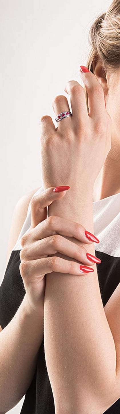 Anello in oro bianco 18k con 3 rubini e diamanti