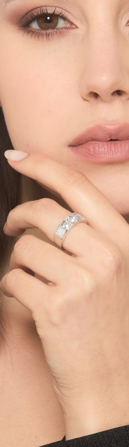 Anello in oro bianco 18k con tre acquamarine e diamanti