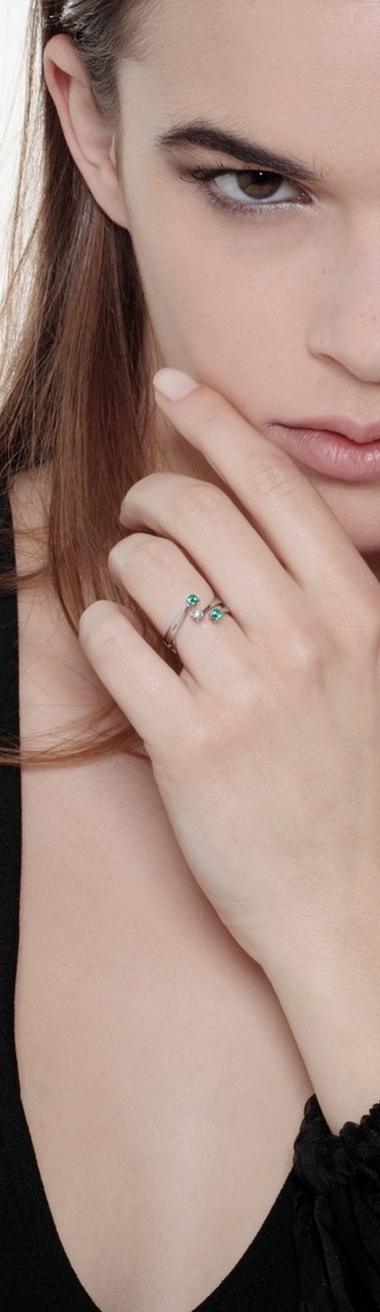 Anello in oro bianco 18k trilogy con fasce incrociate con diamanti e smeraldi
