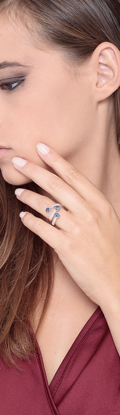 Anello trilogy in Oro Bianco 18k con Diamanti e zaffiri blu