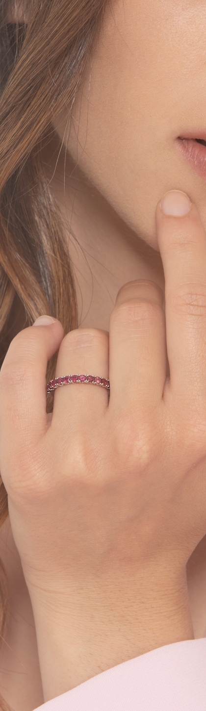 Anello fedina in oro bianco 18k con undici rubini taglio rotondo.