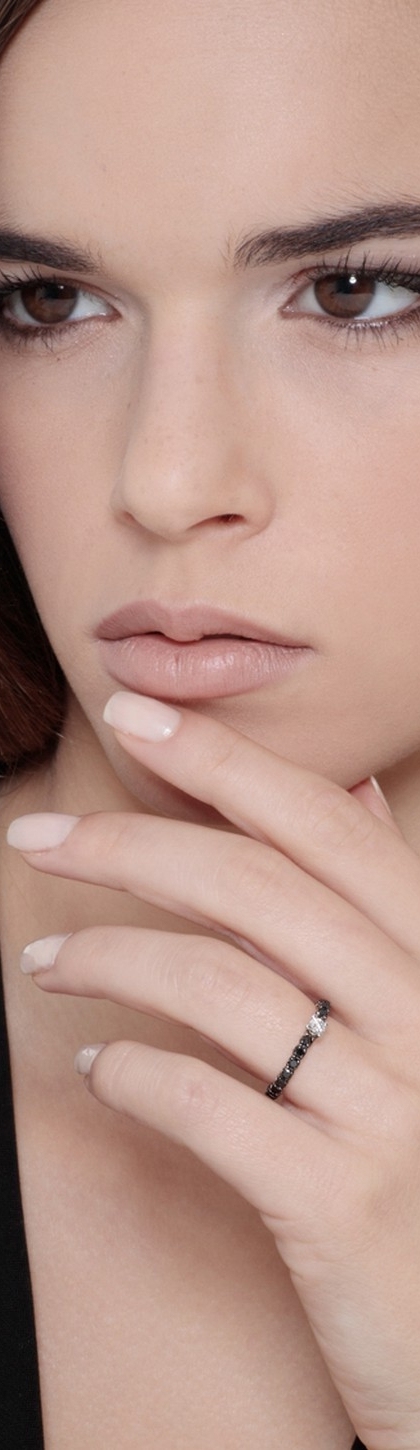 Anello fedina in oro bianco 18k con incastonato diamante taglio brillante, colore G e purezza Vs e diamanti neri laterali taglio brillante.