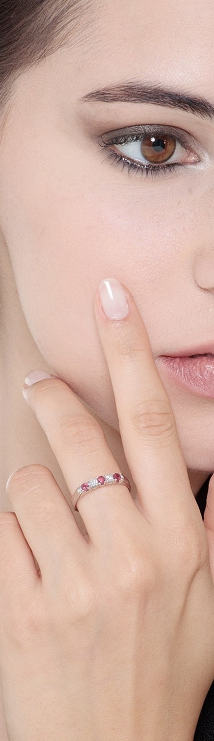 Anello Veretta a 5 pietre in Oro Bianco 18k con due Diamanti e tre Rubini
