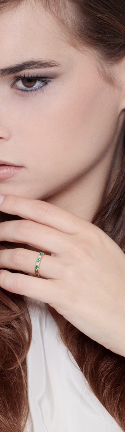 Anello Veretta a 5 pietre in Oro Giallo 18k con Diamanti e Smeraldi.