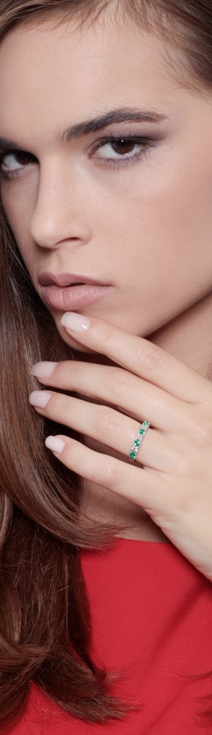 Anello Veretta a 7 pietre in Oro bianco 18k con alternati Diamanti e Smeraldi