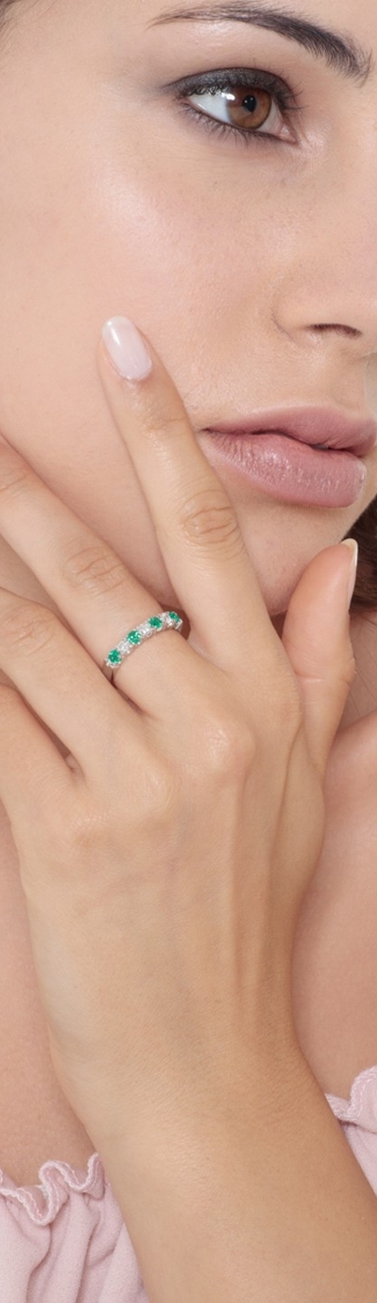 Anello Veretta a 7 pietre in Oro bianco 18k con Diamanti e Smeraldi