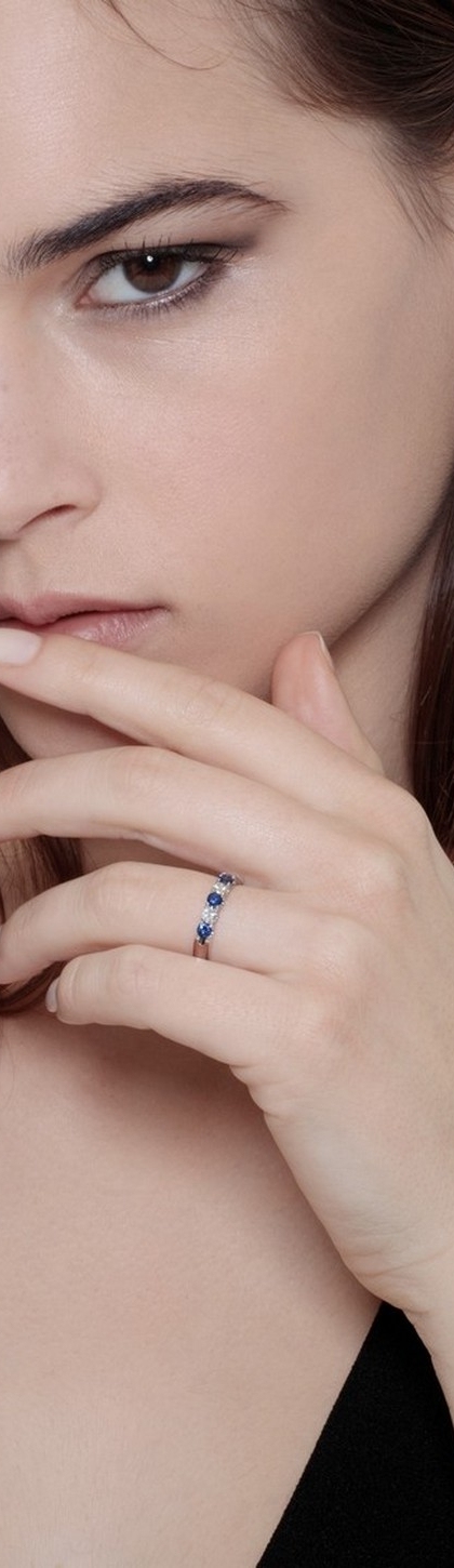 Anello Veretta in Oro bianco 18k con due Diamanti e tre Zaffiri Blu