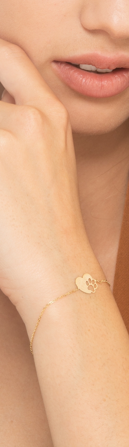 Bracciale in oro giallo 18k con cuore e zampa cagnolino, 16+2 cm