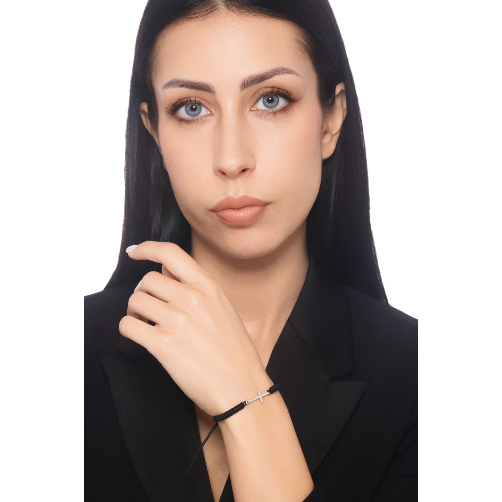 Black tissue bracelet with cross in white gold 18k and diamonds
