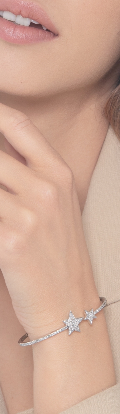 Bracciale in oro bianco 18k, a molla, con 2 stelle in diamanti, diametro circa 4.3x5.4 cm