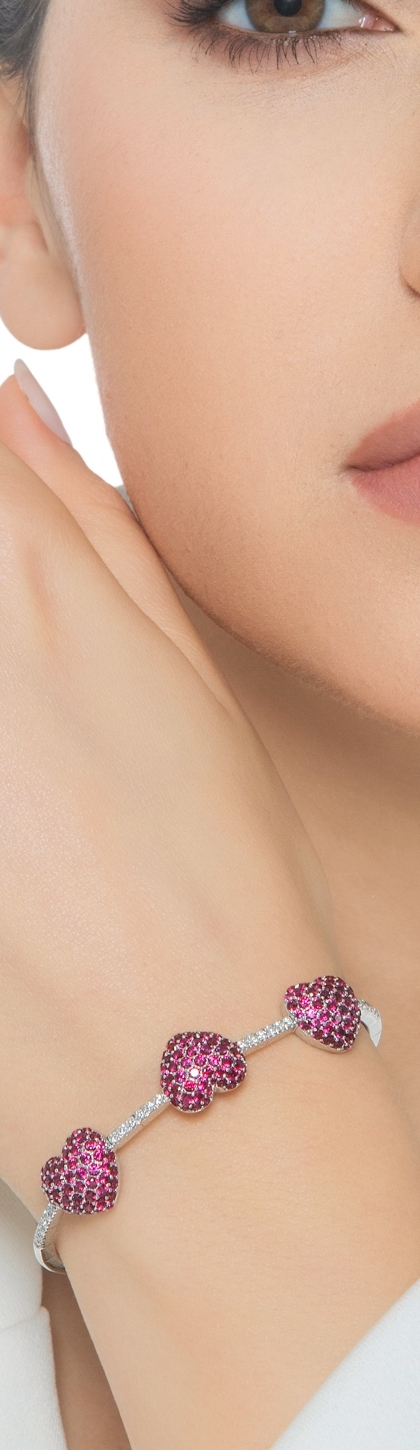Bracciale in oro bianco 18k con 3 cuori in rubini e diamanti ai lati
