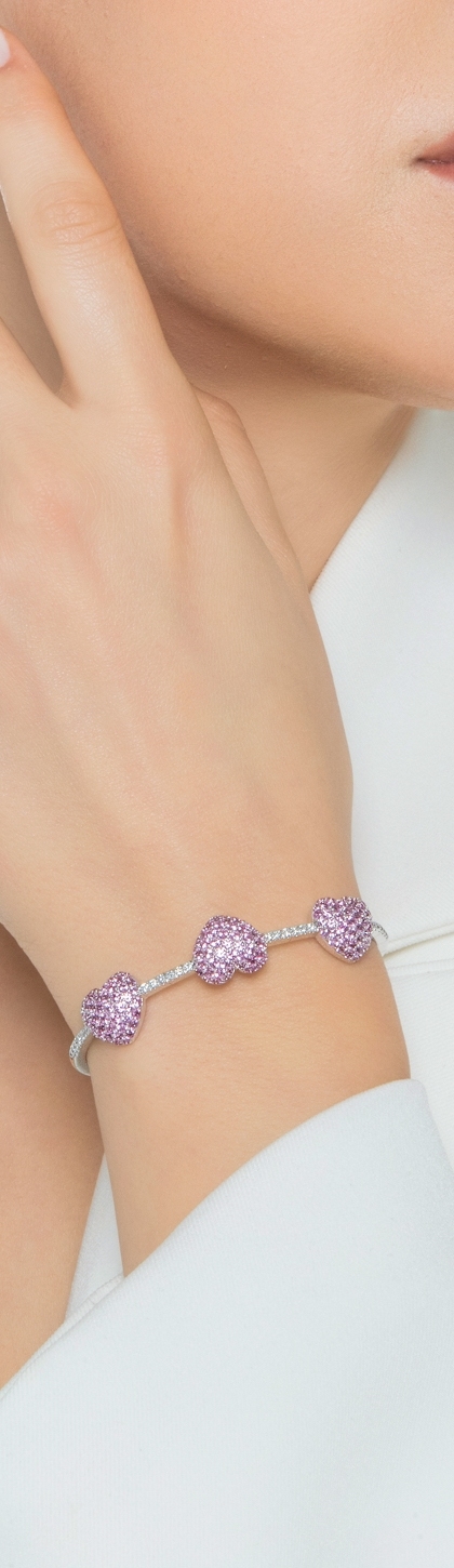 Bracciale in oro bianco 750 con diamanti e tre cuori in zaffiri rosa