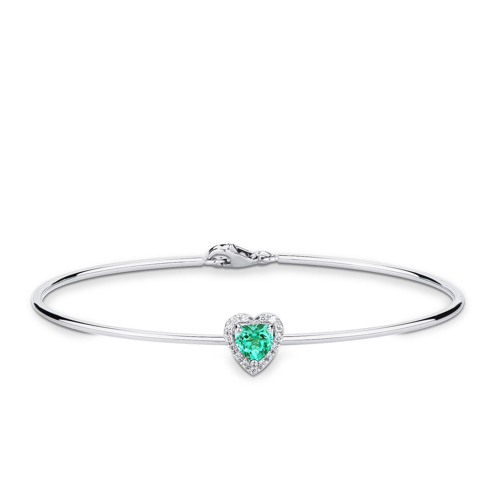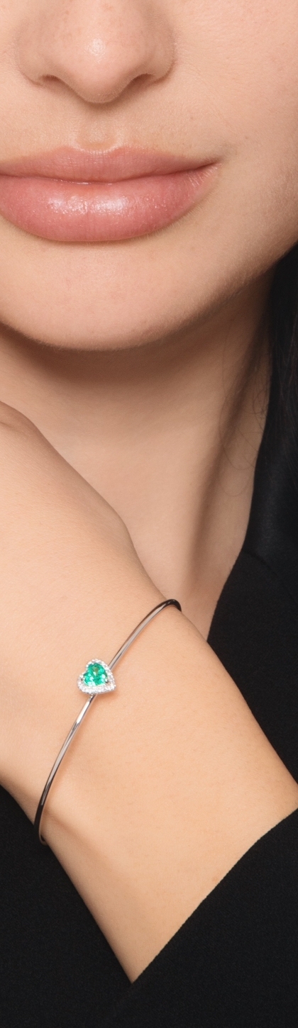 Bracciale rigido in oro bianco 18 carati impreziosito da smeraldo taglio cuore e diamanti taglio brillante colore G e purezza Vs. Il cuore misura circa 5x5 mm.