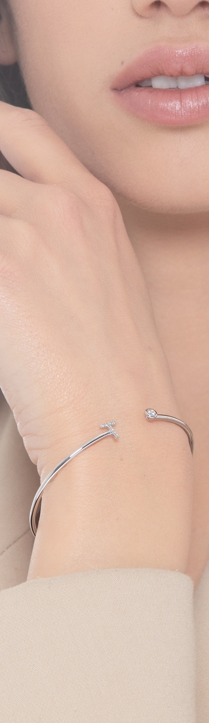 Bracciale rigido in oro bianco 18k con lettera T in diamanti