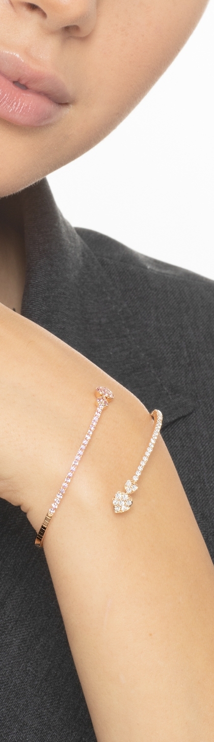 Bracciale semirigido in oro rosa 18k con cuori alle estremità e incastonati diamanti e zaffiri rosa