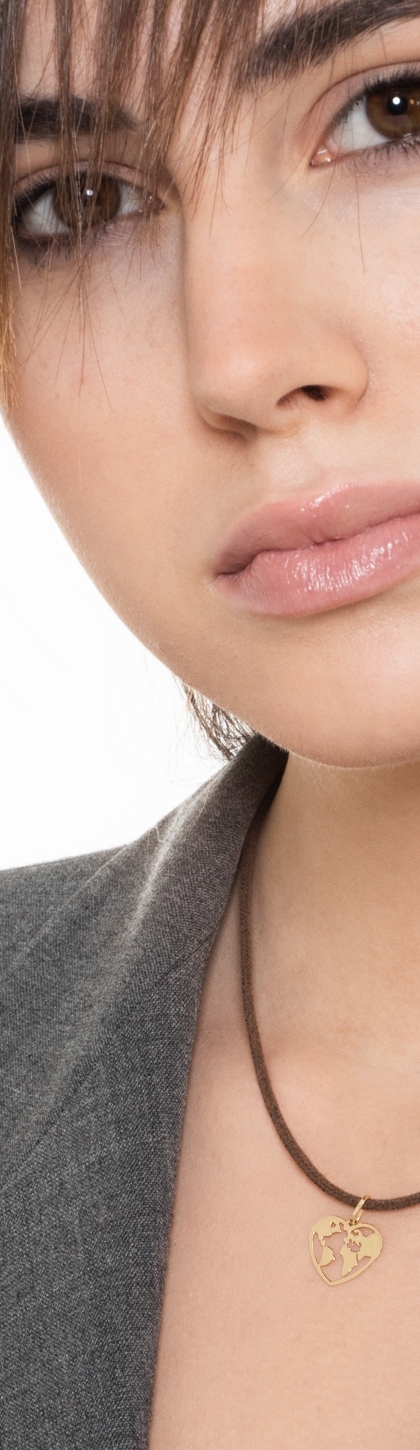 Ciondolo in oro giallo 18k a forma di cuore con, all'interno, mappamondo