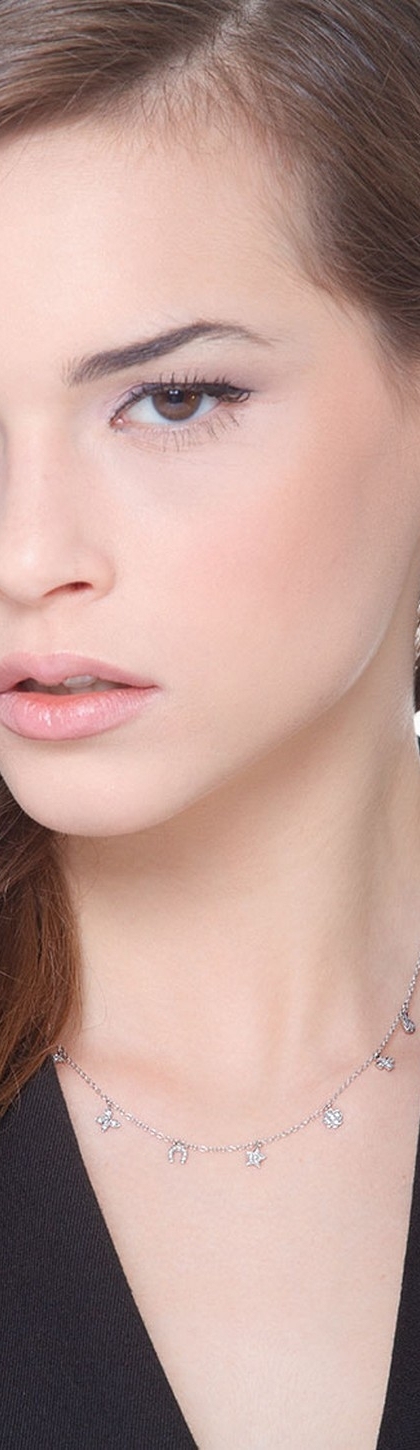 Collana con 7 charms in oro bianco 18k con diamanti.