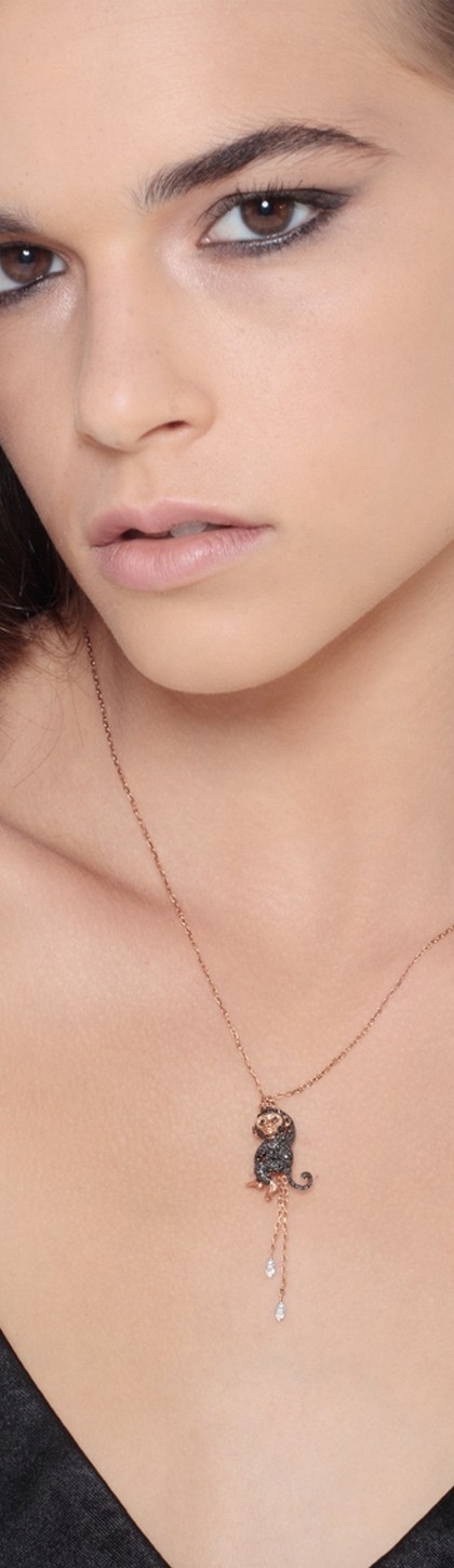 Collana con ciondolo scimmia pavè in diamanti neri in oro rosa e bianco 18k