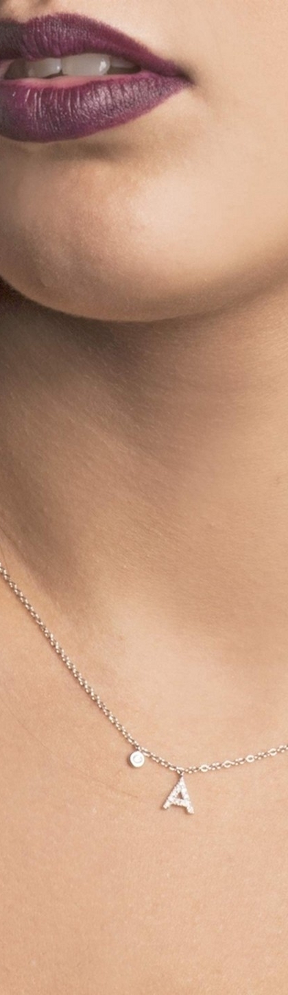 Collana con lettera A e punto luce in oro bianco 18k e diamanti