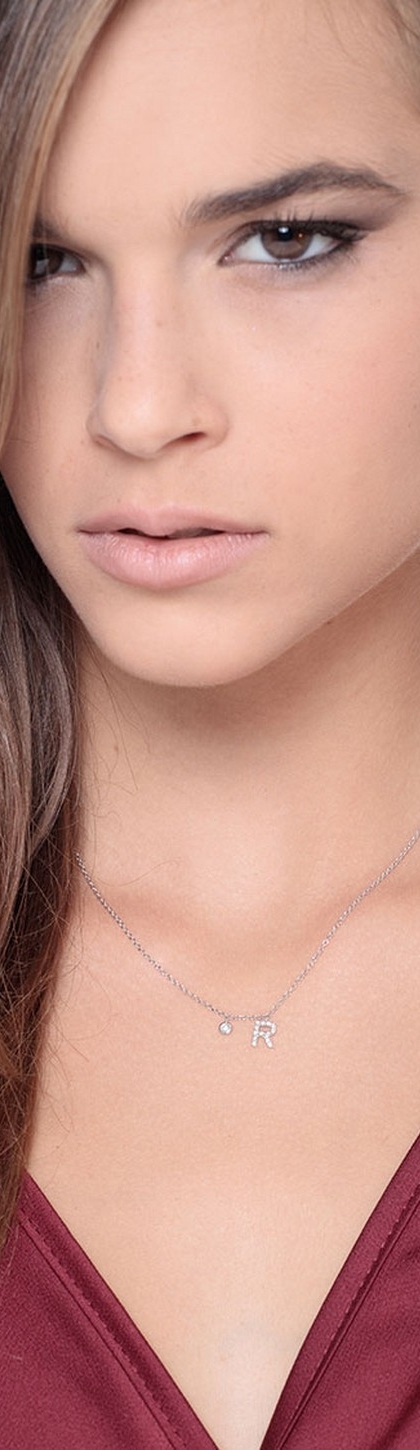 Collana con lettera R e punto luce in oro bianco 18k e diamanti