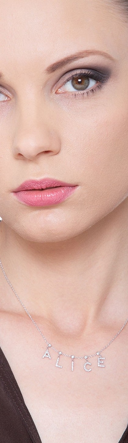Collana in oro bianco 18k, con il nome ALICE incastonata di diamanti taglio brillante colore G e Purezza Vs. Altezza lettere 7 mm. Le lettere sono agganciate a cipolline con diamante.